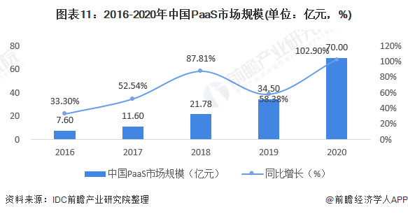从中国用户PaaS应用来看,市场需求正从最初的搜索、地图引擎服务、web服务逐渐向大数据分析、安全监控等服务转变,近几年中国PaaS市场规模增长速度较快。2020年,中国PaaS市场规模为70亿元,同比增长102.9%。