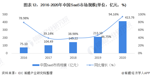 从中国SaaS市场规模来看,2016-2020年市场规模呈现上升态势。2020年,中国SaaS市场规模约为413.76亿元,同比增长94.16%。